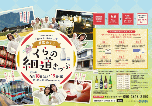 西鉄が、北野町と大刀洗町の酒蔵4ヶ所を「飲み比べおちょこ」で1杯ずつ酒の試飲と特典がもらえる企画乗車券を発売します。