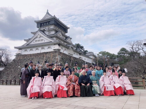 小倉城庭園前では「加冠の儀」を祝って小笠原流弓の儀式「三々九手挟式」も行われます。