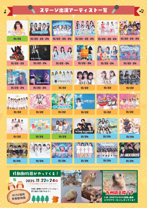 また、地元アイドルやアーティストによるステージライブ、体験型移動動物園「WISE」(22・24日)、豪華景品が当たるビンゴ大会も行われます。