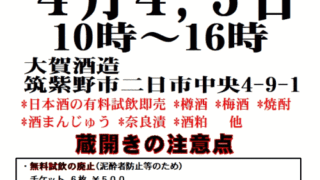 福岡県のイベント大賀酒造 蔵開き 2026年4月4日(土)~5日(日) 10:00~16:00 福岡県/筑紫野市/大賀酒造 福岡県で一番古い酒蔵で行われる蔵開き。 日本酒の有料試飲即売や、樽酒・梅酒・焼酎・酒まんじゅう・奈良漬・酒粕などの販売が行われます。 ...福岡県のイベント