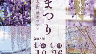福岡県のイベント八女黒木 大藤まつり 2026年4月10日(金)~26日(日) *ライトアップ=19:00~21:00 福岡県/八女市(黒木町)/素盞嗚(すさのお)神社と周辺 樹齢630年余の歴史を誇る国指定天然記念物「黒木のフジ」の開花に伴い、「八女黒木大藤まつり...福岡県のイベント