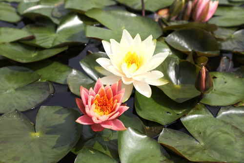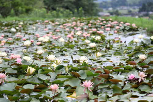 見頃の時期になると、黄・白・ピンクのスイレンが、一面に広がります。