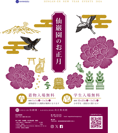 | 【入園料】 | 国指定名勝 仙巌園・尚古集成館/一般1,600円、小中高校生800円 *2025年12月25日(木)~2026年1月7日(水)は、小中学生・高校生の入場無料 *2026年1月1日(木)~3日(土)は、着物でお越しいただいたお客様の入場無料 |