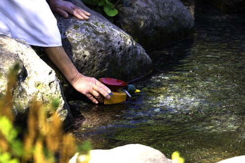 「曲水宴」は、上流から流した酒盃が目の前を通り過ぎないうちに、和歌をしたため、酒をいただく優雅な春の宴です。