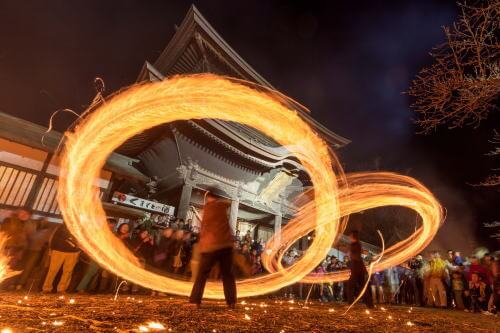 勇壮に振り回される炎の輪が重なり合い、夜の神殿を彩り、一帯は幻想的な雰囲気に包まれます。