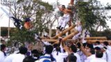 樫の枝葉で包まれた姫神の御神体が到着すると、氏子は一斉に縄の先の茅束に火をつけて振り回します。