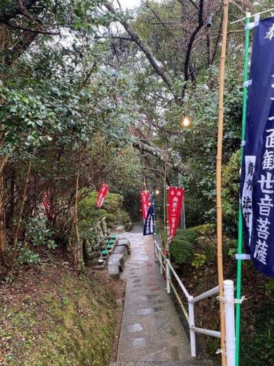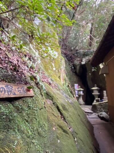 椿が咲き、石仏が並ぶ参道を進むと、岩屋の洞窟が2ヶ所あります。
