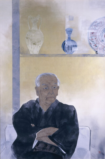 この作品を描くきっかけとなったのは、師の堅山南風が描いた《大観先生像》でした。40年以上にわたり師と仰いだ大観が威厳を保ちながらも、一方で等身大の人間としての大観がありのままに表されています。
