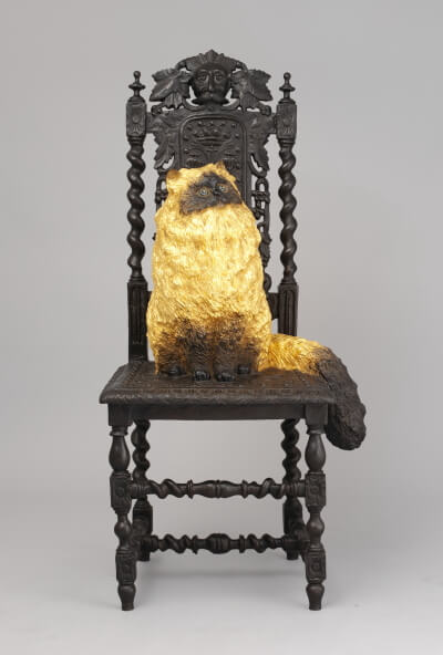 家族をモティーフとした《慈愛》や家族が飼っていたペルシャ猫のハッピーを主役に据えた《大将の椅子》などの作品が挙げられます。《大将の椅子》では、骨董品店で見つけた年代物の椅子自体をブロンズで再現するという、富永らしい細部へのこだわりも見ることができます。