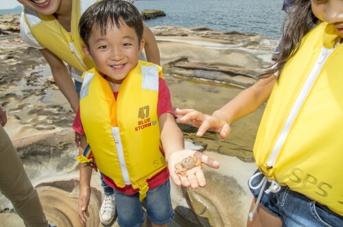 ふたつの無人島に上陸して、磯での生きもの観察や砂浜遊びが楽しめます。
