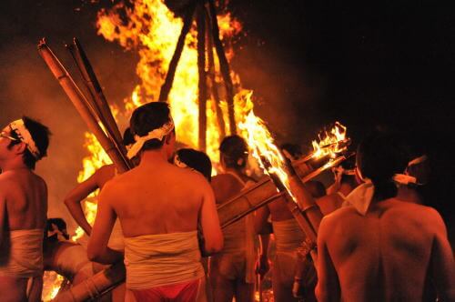 1,300年余りの歴史を持つ伝統行事、鷹栖観音の「鬼会」は、締め込み姿で約 2メートルの松明を掲げて厳寒の駅館川を渡り、高さ約 10メートルのドンドに火をつけた後、松明を打ち合う勇壮な“水と火の祭り”で、一年の無病息災と五穀豊穣を祈願します。