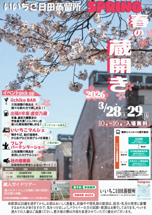 また、「蔵人ガイドツアー(要予約・参加無料)」や、日田のご当地グルメなどが堪能できる「いいちこマルシェ」、杜の音楽会、工作教室などイベントが盛りだくさん!