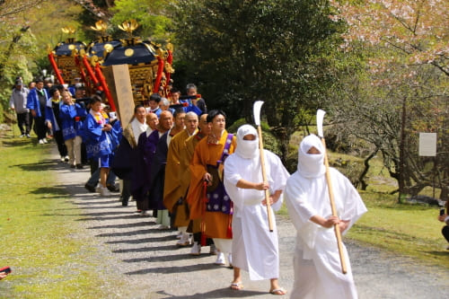 講堂での法要の後、ホラ貝の響きを合図に「お上り」が始まり、薙刀をもった白装束の僧兵を先頭に、三基の神輿が下宮から200メートル離れた本堂へ練り歩きます。