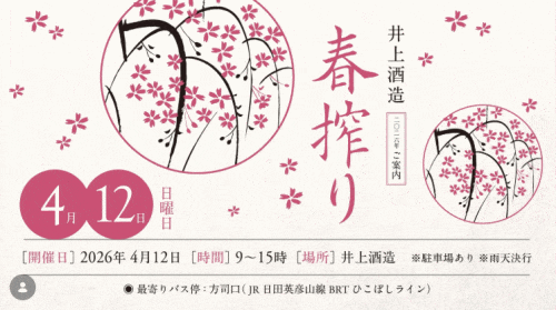 井上酒造 春搾り 2026.04.05 大分県のイベント グルメ 2026年4月2026年4月12日(日) 9:00~15:00 大分県/日田市/井上酒造 問合せ先:井上酒造 TEL 0973-28-2211ご参考・・井上酒造Webサイトへ公式 Instagramへ公式 facebookへ地図