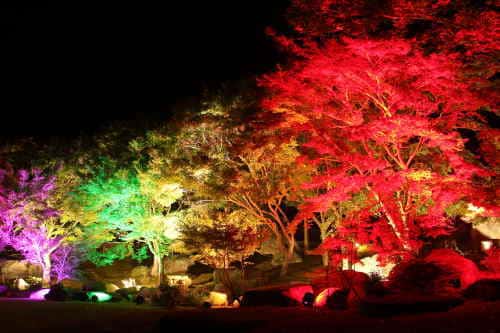 50種2万本以上の樹木に池、岩、滝などが四季折々に、見事な調和を見せる公園をライトアップします。