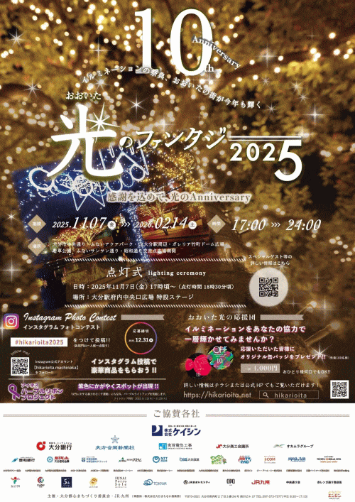 大分まちなか倶楽部とJR大分シティが共同で開催し始めて10周年を迎える今年のイベントは、JR大分駅の府内中央口広場から昭和通り交差点南側までの中央通りをはじめ、ふないアクアパーク、ガレリア竹町ドーム広場、若草公園、ふないサンサン通りが、来年2月14日まで約55万球の光で華やかに染まります。