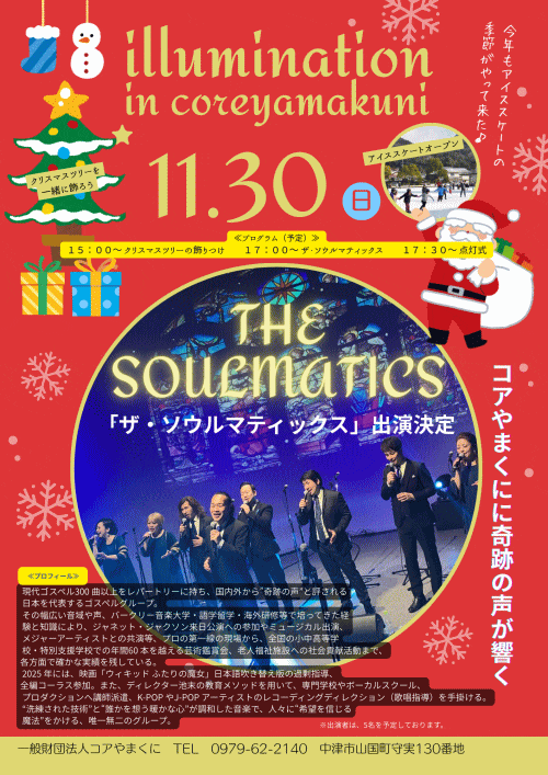 日本を代表するゴスペルグループ「ザ・ソウルマティックス」がコアやまくにに奇跡の声を響かせます。