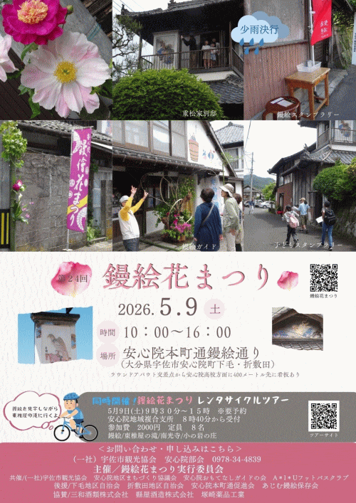 第24回 鏝絵花まつり 2026.04.18 大分県のイベント 見る 体験 2026年5月2026年5月9日(土) 10:00~16:00 大分県/宇佐市(安心院町)/本町鏝絵通り 問合せ先:鏝絵花まつり実行委員会事務局(宇佐市観光協会内) TEL 0978-34-4839詳細は・・宇佐市観光協会Webサイトへ地図