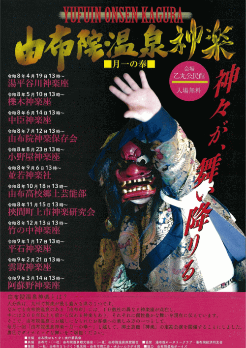 由布院温泉では、伝統芸能「神楽」の定期公演が月に一度開催されています。