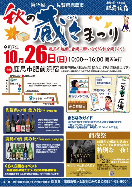 問合せ先:肥前浜宿 秋の蔵々まつり実行委員会(事務局:肥前浜宿水とまちなみの会) TEL 0954-69-8004
