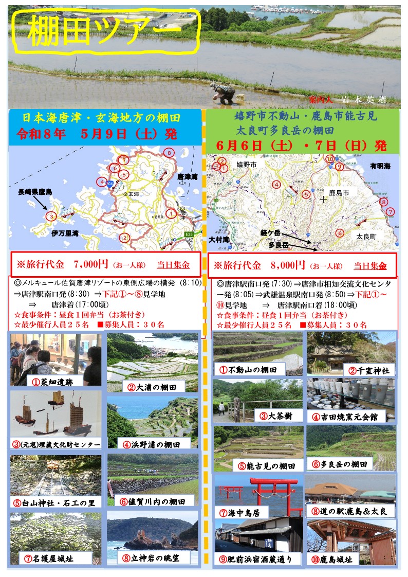 キラキラと水面が輝く初夏の季節に、唐津・玄海、そして有明海沿岸の名だたる棚田を巡る特別ツアーを開催します。