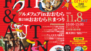 長崎県のイベントグルメフェアinおおむら&第25回おおむら秋まつり 同時開催 2025年11月8日(土) 10:00~15:00 長崎県/大村市/ボートレース大村 第5駐車場 今年も「グルメフェアinおおむら」と「おおむら秋まつり」が同時開催されます! 「グルメフェアinおおむら」では、県内外のおすすめ...長崎県のイベント