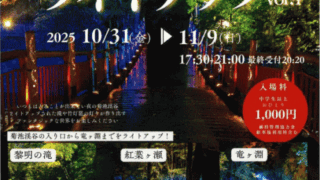 熊本県のイベント菊池渓谷ライトアップ 2025年10月31日(金)~11月9日(日) 17:30~21:00(最終受付20:20) 熊本県/菊池市/菊池渓谷 普段入ることができない夜の菊池渓谷。 光とライトアップ、竹灯籠の灯りで非日常の世界へと誘いま す。 今年...熊本県のイベント