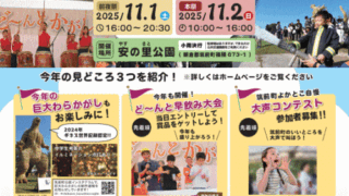 福岡県のイベント第21回ど~んとかがし祭 2025年11月1日(土)~2日(日) 1日=16:00~20:30、2日=10:00~16:00 *花火打上=1日20:00~ 福岡県/筑前町/安の里公園 筑前町の自然の恵みに感謝し、収穫を喜びあう祭。 祭のシンボルとなる恒...福岡県のイベント