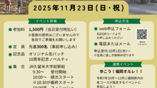 福岡県のイベント九州オルレ認定10周年記念 高良山もみじ狩りオルレ 2025年11月23日(日・祝) 10:00~スタート *雨天決行・荒天中止 福岡県/久留米市/スタート:JR「久留米大学前 駅前、ゴール:JR御井駅 高良山の紅葉が見頃を迎える九州オルレ久留米・高良山コース。 オルレフェアで...福岡県のイベント